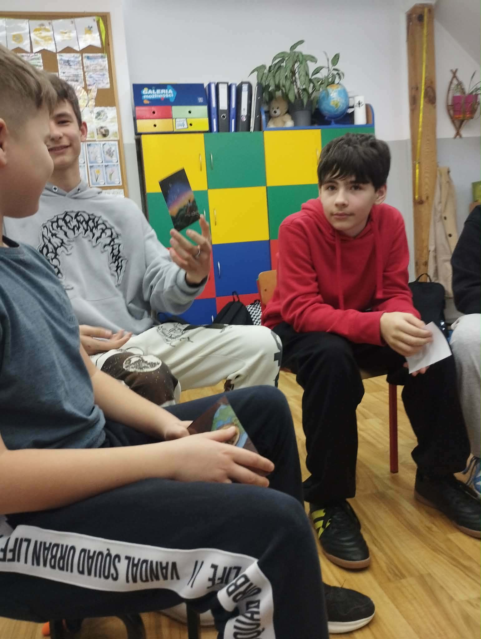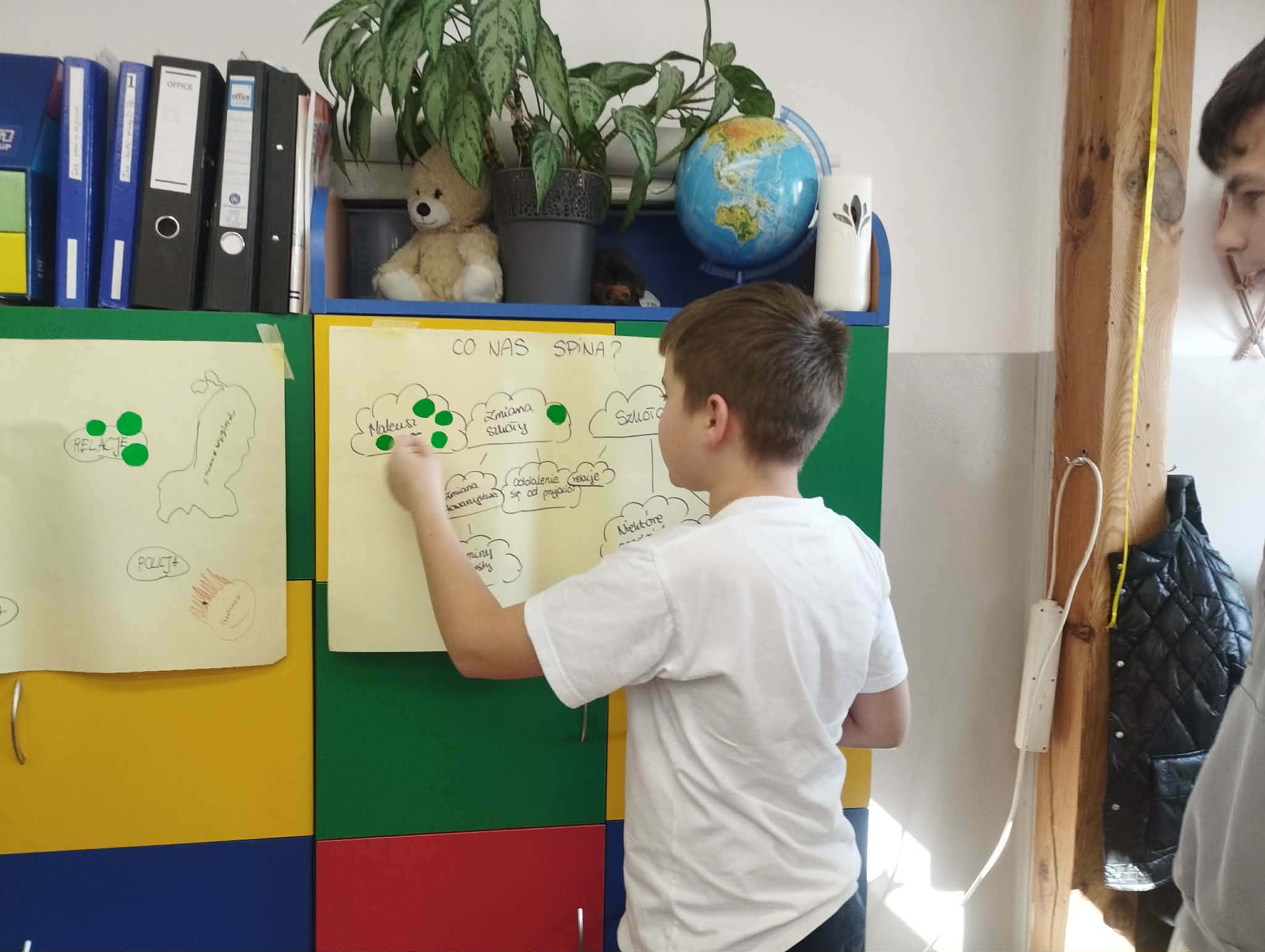 Nie zabrakło refleksji nad własnymi mocnymi stronami – uczniowie wskazali swoje „trzy zasoby”, budując świadomość własnej wartości. Zajęcia zakończyliśmy rundką podsumowującą i jednym słowem opisującym swoje samopoczucie.