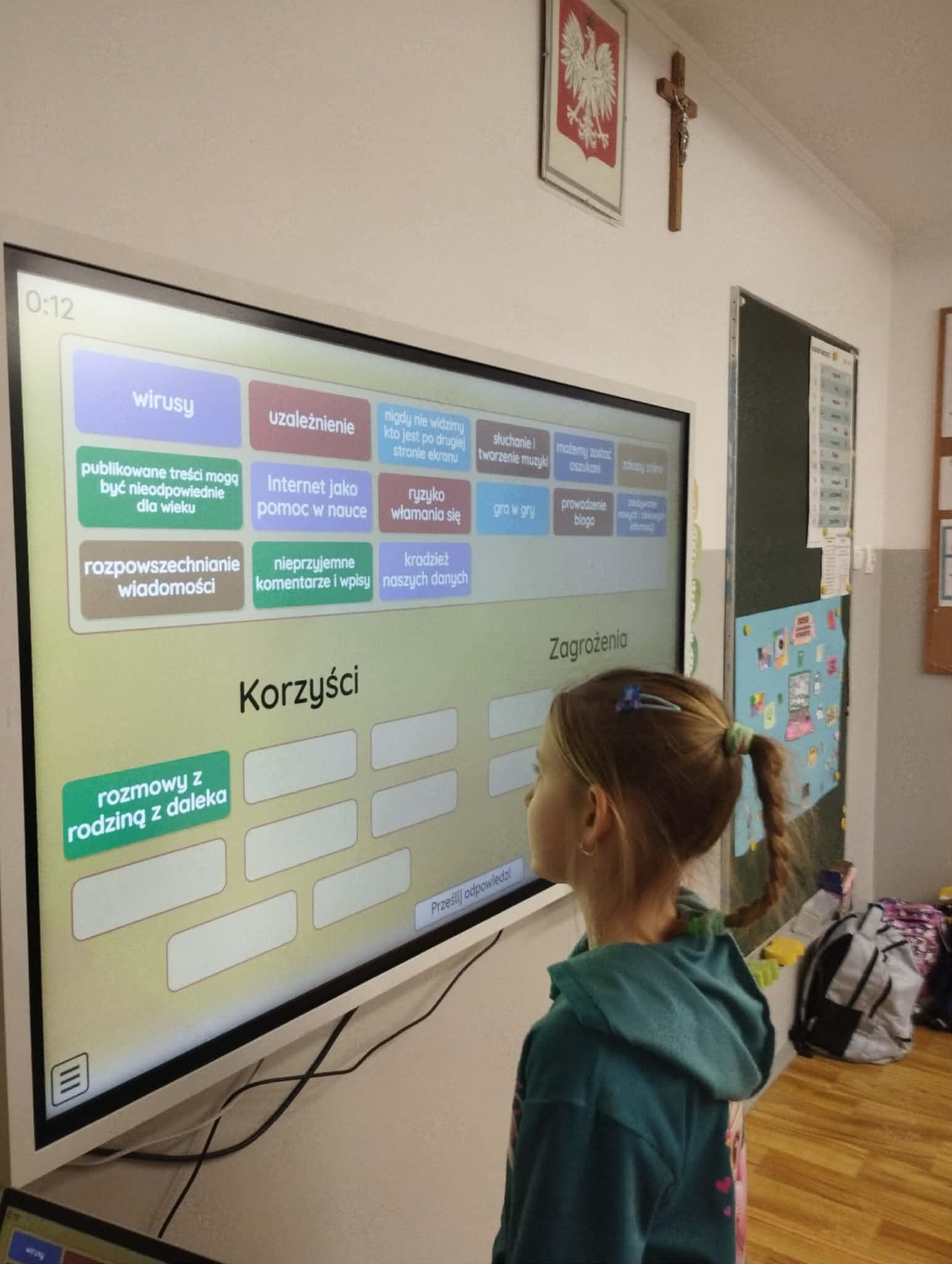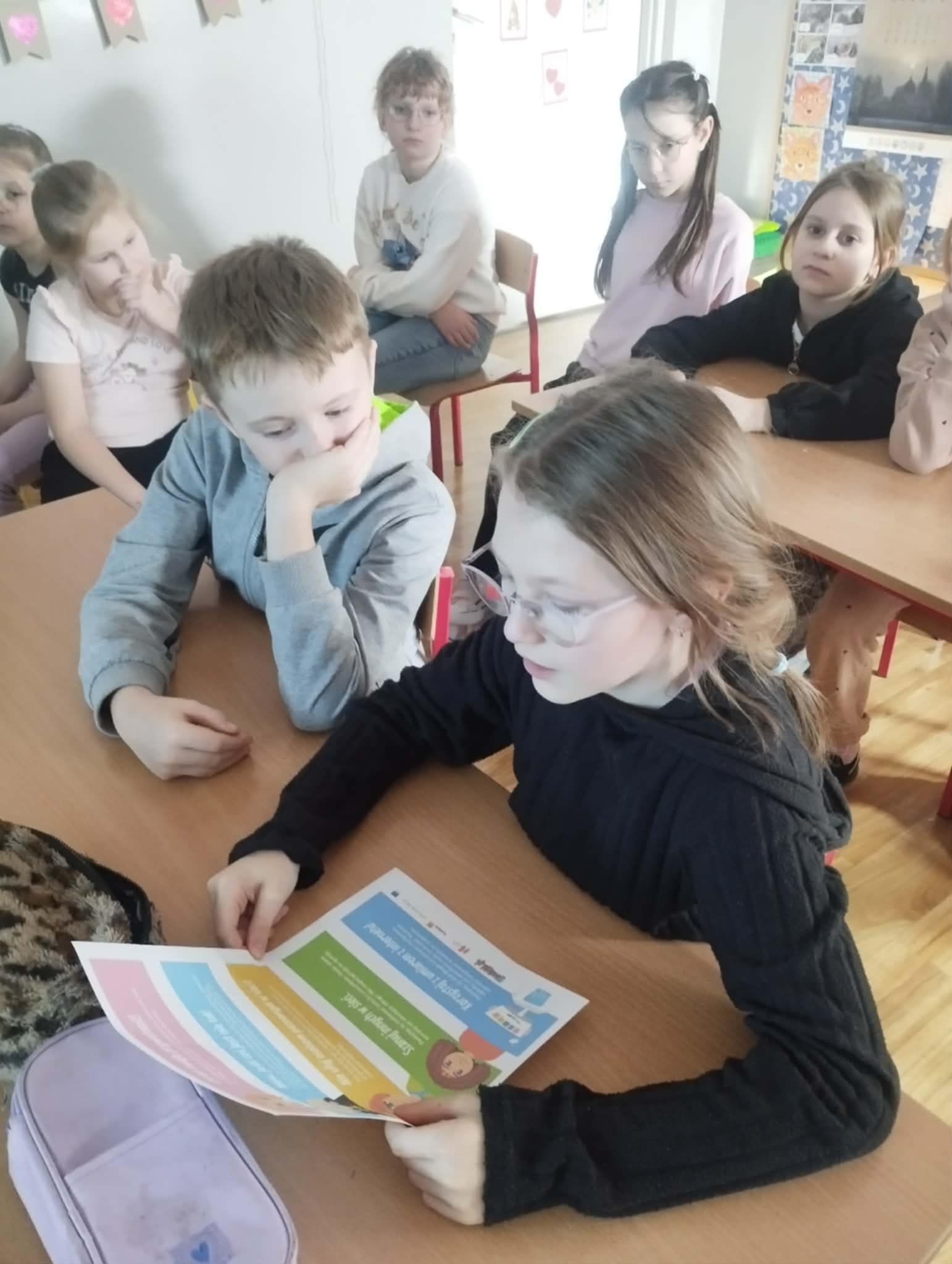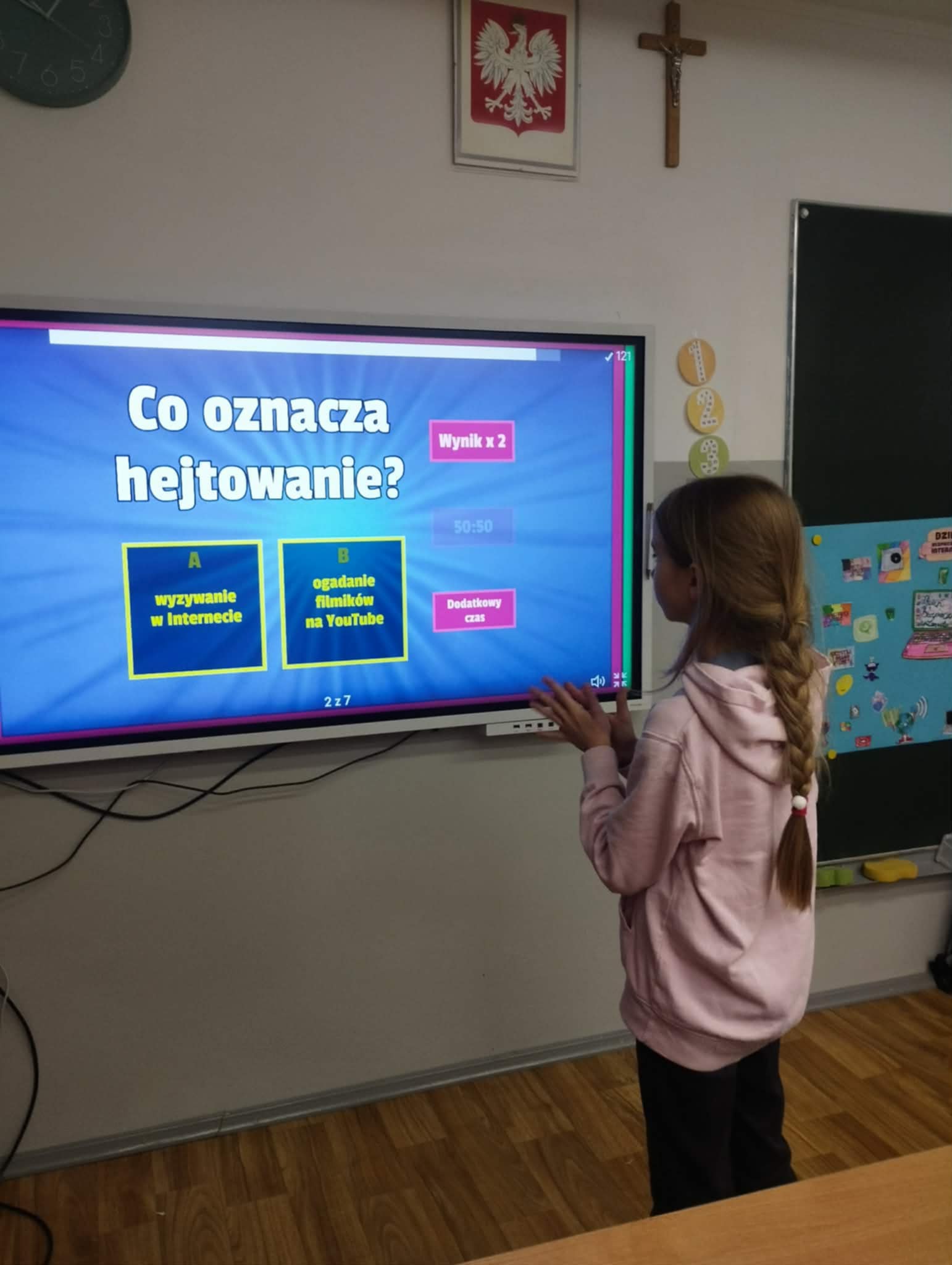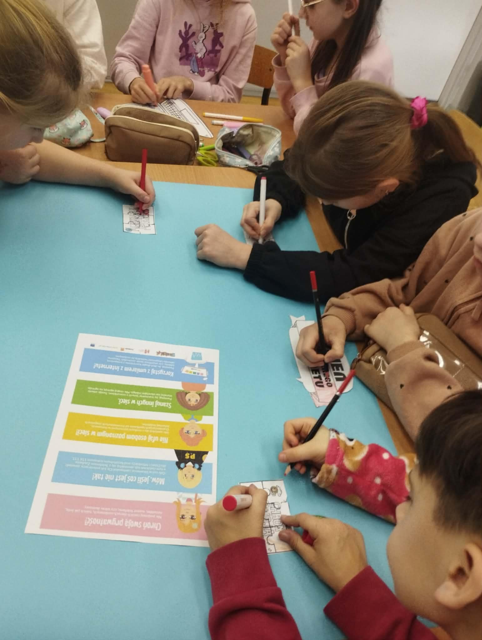 Uczniowie obejrzeli film edukacyjny „Bezpieczne dzieci w internetowej sieci”, rozwiązywali quizy i zagadki na tablicy multimedialnej oraz wspólnie przygotowali plakat z zasadami bezpiecznego korzystania z internetu- była to doskonała okazja do współpracy i nauki przez działanie. Natomiast Samorząd Uczniowski przygotował gazetkę szkolną poświęconą tej tematyce.